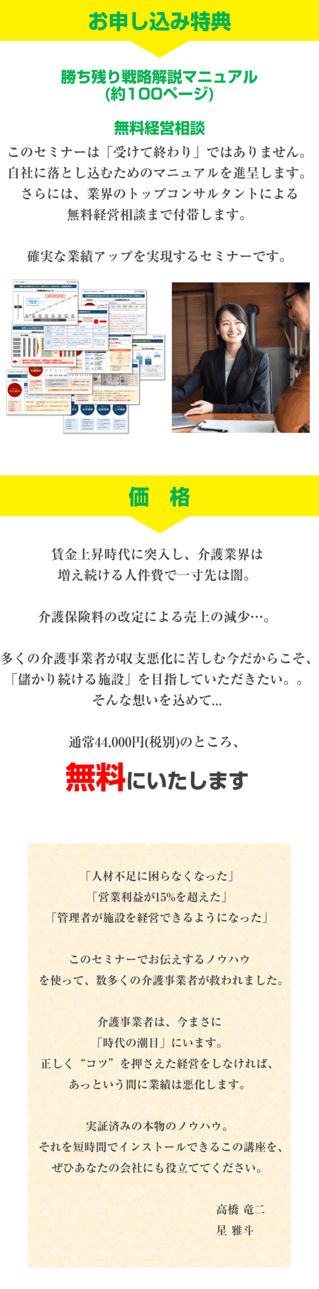 セミナー当日アンケートのご回答をして頂くと、100ページ以上にわたる介護施設業績アップマニュアルをプレゼントさせて頂きます!